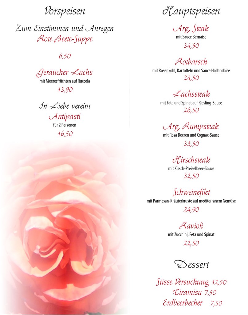 Sa - 14. Feb 2026 ab 17:00 Uhr Valentinstag 2026 Zum Valentinstag haben wir eine ganz spezielle Karte für Sie! mehr lesen teilen per Facebook per Twitter per Google+ per E-Mail
